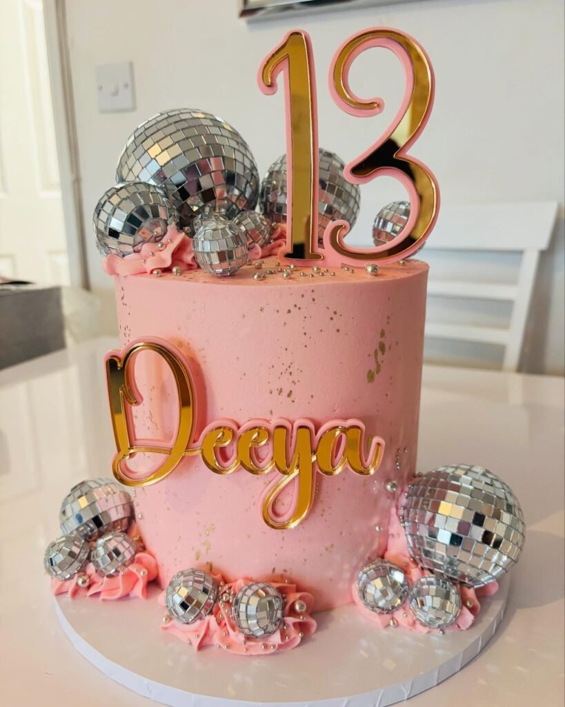 This show-stopping pink cake brings serious glamour to any 13th birthday party idea collection. Multiple disco balls create that coveted sparkle factor, while “Leeya” in gold lettering adds the personal touch every birthday teen desires. The pink frosting feels fun yet sophisticated.