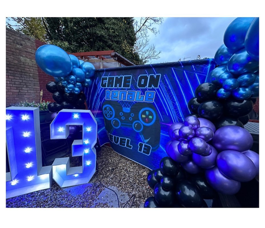 The outdoor tent setting provides excellent party space while the lighting effects make everything feel like a real gaming tournament. Notice how the blue color scheme creates cohesion between the backdrop, lighting, and balloon decorations. The “Level 13” messaging cleverly incorporates the birthday age into gaming terminology.