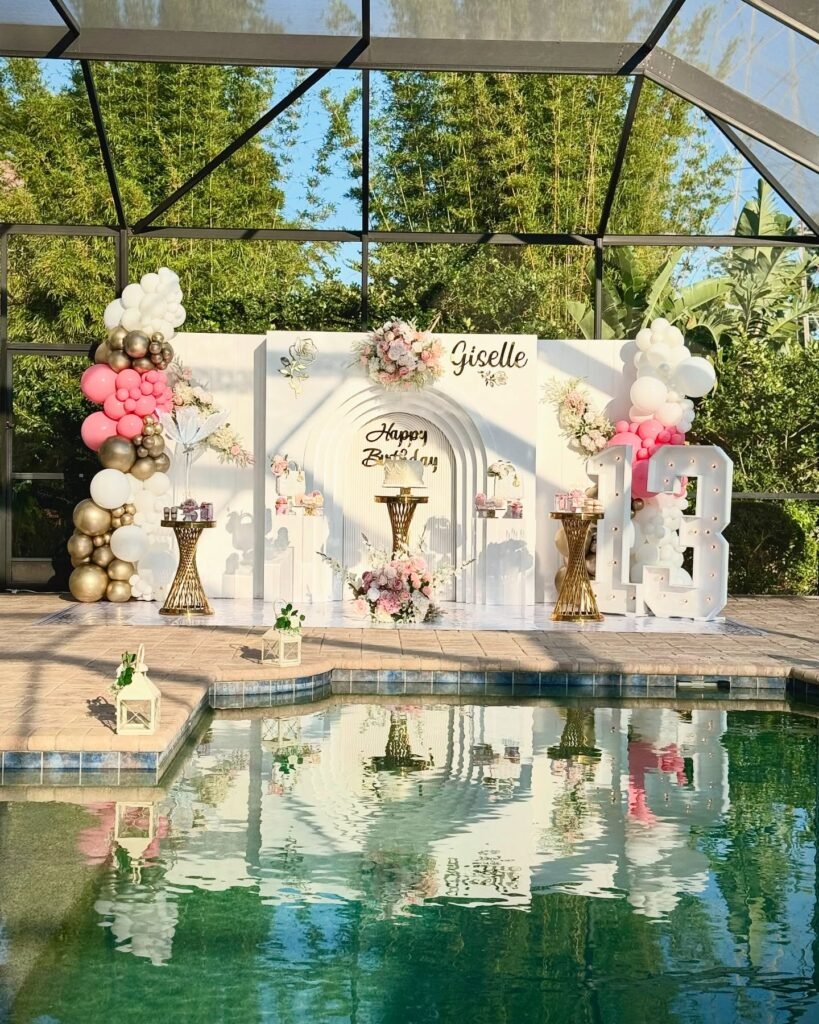 This refined celebration features stunning white backdrop design with gold accents and beautiful floral arrangements. “Giselle” appears in elegant lettering while the arch design creates a sophisticated party focal point. The poolside setting adds luxury appeal that teens find impressive.