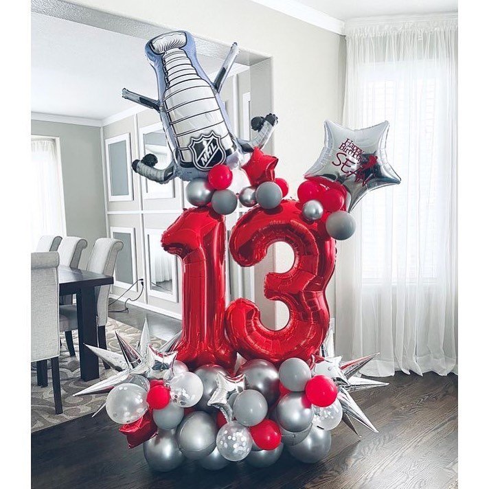 The balloon arrangement creates vertical interest while maintaining focus on the birthday age. The hockey stick element adds personality and shows attention to the birthday teen’s specific interests. Star-shaped foil balloons provide additional celebratory elements without overwhelming the main design.