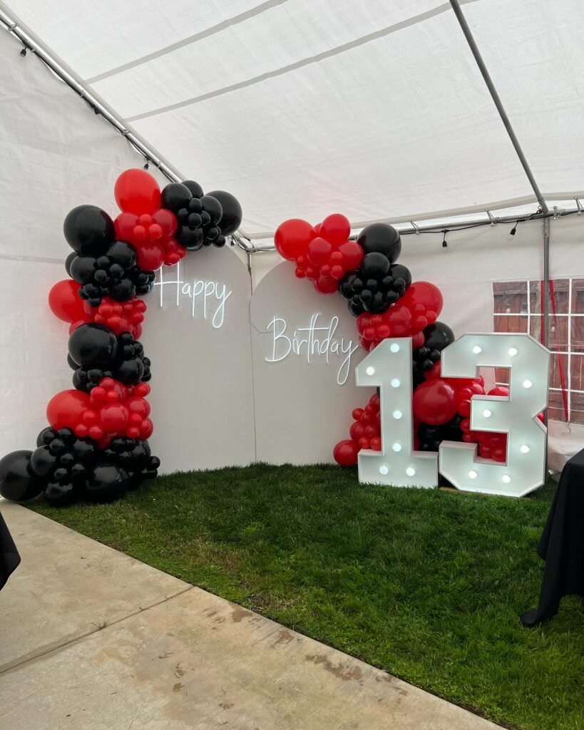 This striking 13th birthday party idea features a bold red and black balloon arch with illuminated “Happy Birthday 13” lettering. The tent setting provides excellent party space while the dramatic color contrast creates sophisticated appeal that teens love.