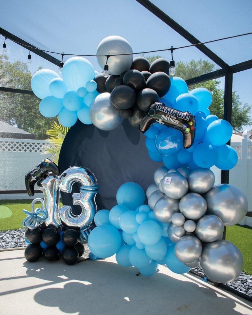Those silver number balloons spelling “13” add the birthday element without overwhelming the gaming theme. The outdoor pergola setting gives party guests plenty of space to move around and enjoy activities. Notice how the balloons create natural boundaries and define the party space.
