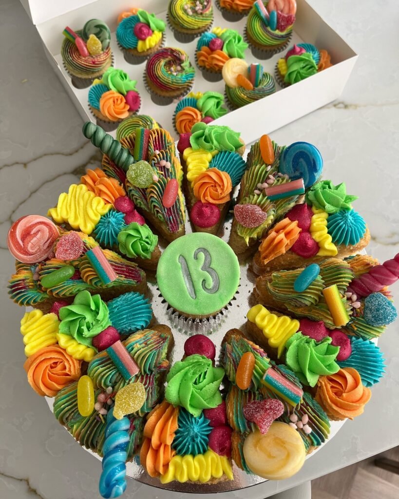 Forget traditional birthday cakes when you can create a show-stopping cupcake display that doubles as edible art. This 13th birthday party idea features vibrant rainbow buttercream swirls topped with colorful candies and treats that make every bite an adventure.