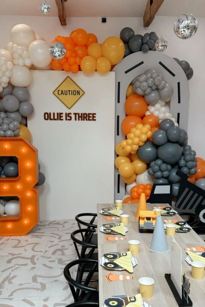 Step into a vibrant construction site for a boy’s 3rd birthday party, bursting with color and playful details. A large, illuminated number “3” sets a festive mood, inviting guests into the celebration. Overhead, a dynamic balloon garland in oranges, greys, and yellows mimics a bustling road.