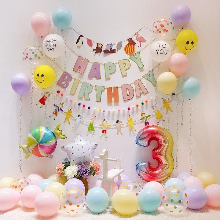 Notice the eye-catching “Happy Birthday” banner and the striking number “3” balloon, announcing his milestone in style. Star-shaped balloons add a touch of whimsy to the simple yet effective decor. These elements create a lively and fun atmosphere for capturing precious moments.