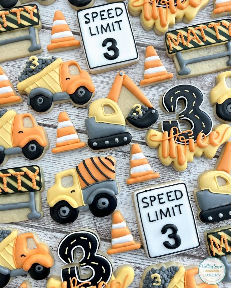 Observe the intricate details: dump trucks, excavators, and traffic cones are all expertly decorated. Even “Speed Limit 3” signs add a playful nod to the birthday milestone. These cookies are not just treats; they are tiny works of art that enhance the party’s theme.