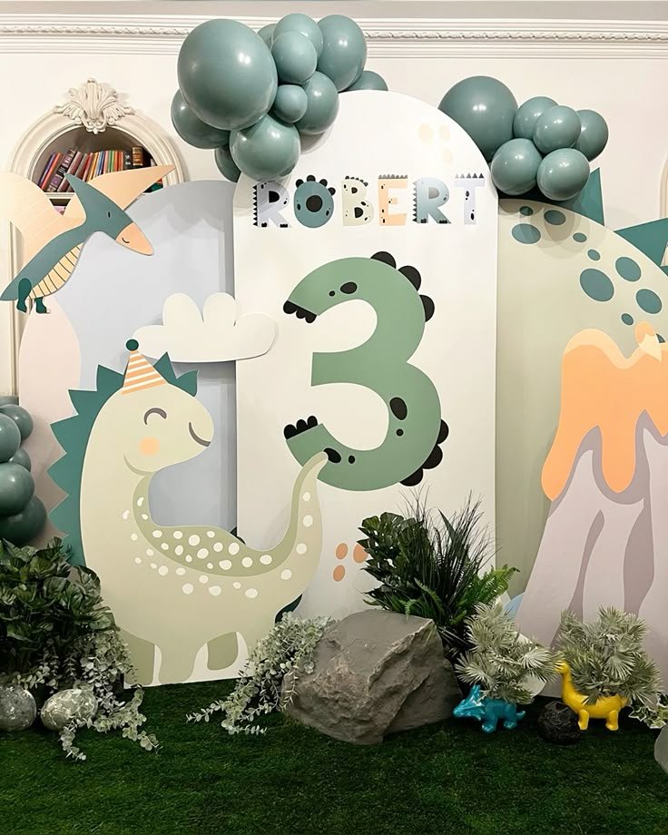 Notice the delightful details that make this 3rd birthday party for a boy so memorable. A cheerful green dinosaur, complete with a party hat, greets guests alongside a towering number three. Soft, dusty green balloons create a natural canopy, enhancing the Jurassic atmosphere for young explorers.