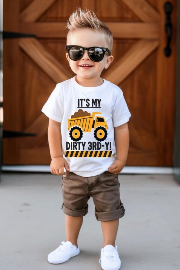 This charming outfit is truly fitting for a 3rd birthday party for a boy. The vibrant yellow and black colors of the dump truck stand out against the white tee, creating a playful yet stylish look. Coupled with sunglasses and a confident smile, he looks ready for a day of fun.