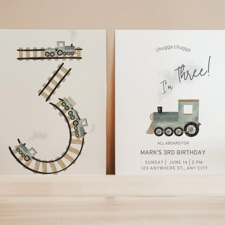 Announce a delightful 3rd birthday party for a boy with this charming train-themed invitation. The design playfully incorporates a train forming the number “3,” instantly setting a fun tone. It hints at an exciting journey for all the young guests.