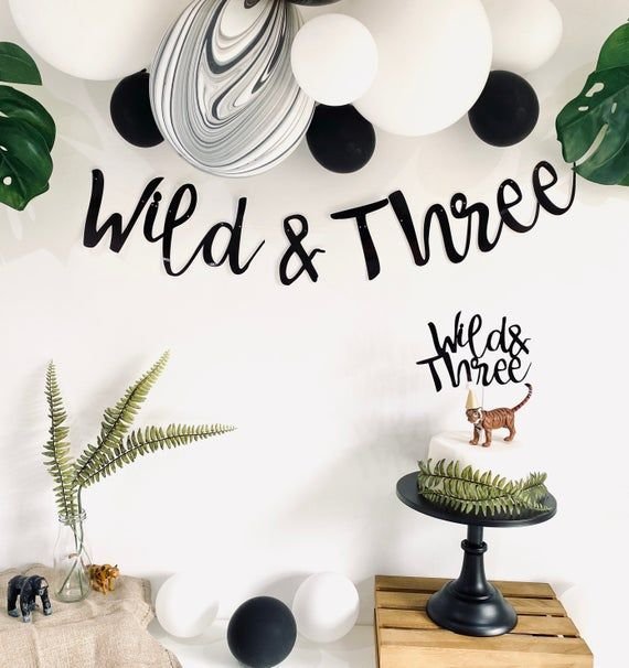 Embark on a wild adventure for a boy’s 3rd birthday party with this chic “Wild & Three” theme. The striking banner, paired with a sophisticated monochrome balloon garland, creates an effortlessly stylish backdrop. Lush green foliage accents add a touch of the untamed, setting the stage for excitement.