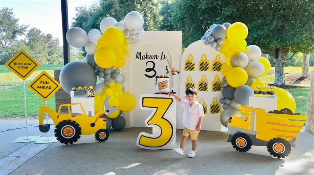 This construction themed setup transforms a third birthday into an exciting worksite celebration. Yellow and gray balloons frame a custom backdrop featuring construction vehicle cutouts and a personalized “Mahan Is 3” sign with crane graphics. The birthday boy stands proudly beside a large number 3, flanked by cardboard dump trucks and bulldozers that add dimensional charm.