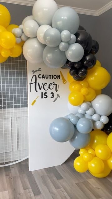 Get ready to celebrate a boy’s 3rd birthday party with this lively construction-themed balloon arch. Bright yellow, black, and various shades of grey and white balloons create a striking and playful display. The contrasting colors truly capture the essence of a building site.