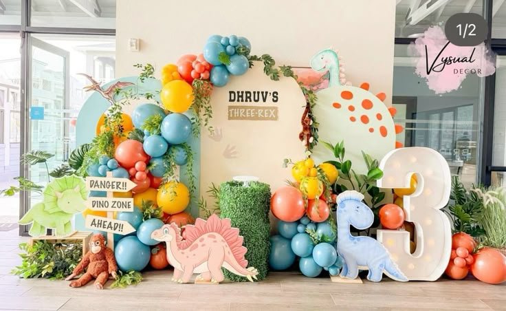 Embark on a thrilling journey to a prehistoric land for a boy’s 3rd birthday party with this amazing dinosaur display. A vibrant balloon garland in blues, oranges, and yellows frames the personalized “DHRUV’S THREE-REX” sign. Lush greenery and charming dinosaur cutouts bring the scene to life.