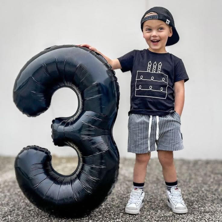 Capture the excitement of a 3rd birthday party for a boy with this fun and casual photo. The beaming birthday boy stands proudly next to a large, glossy black number “3” balloon, announcing his special milestone with flair. His wide smile truly shows his joy.
