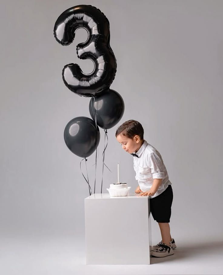 Above him, a bold black “3” balloon floats gracefully, marking his special milestone. Two accompanying black balloons add to the simple yet striking decor. This minimalist setup ensures the focus remains entirely on the joy and significance of the occasion.