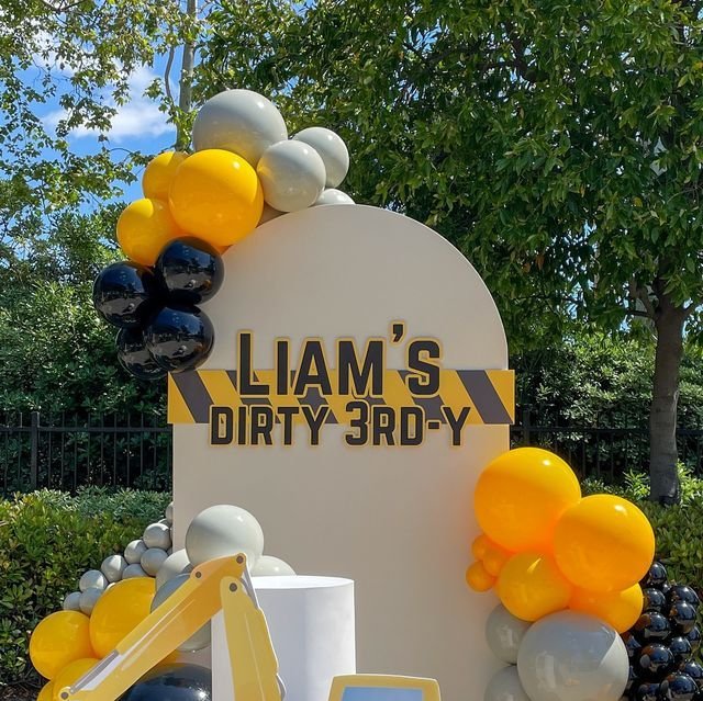 Get ready for a fantastic 3rd birthday party for a boy with this lively construction-themed entrance display. The bold sign announces “Liam’s Dirty 3rd-Y,” immediately setting a playful and adventurous tone. Bright yellow and black balloons, reminiscent of caution tape, frame the personalized message.