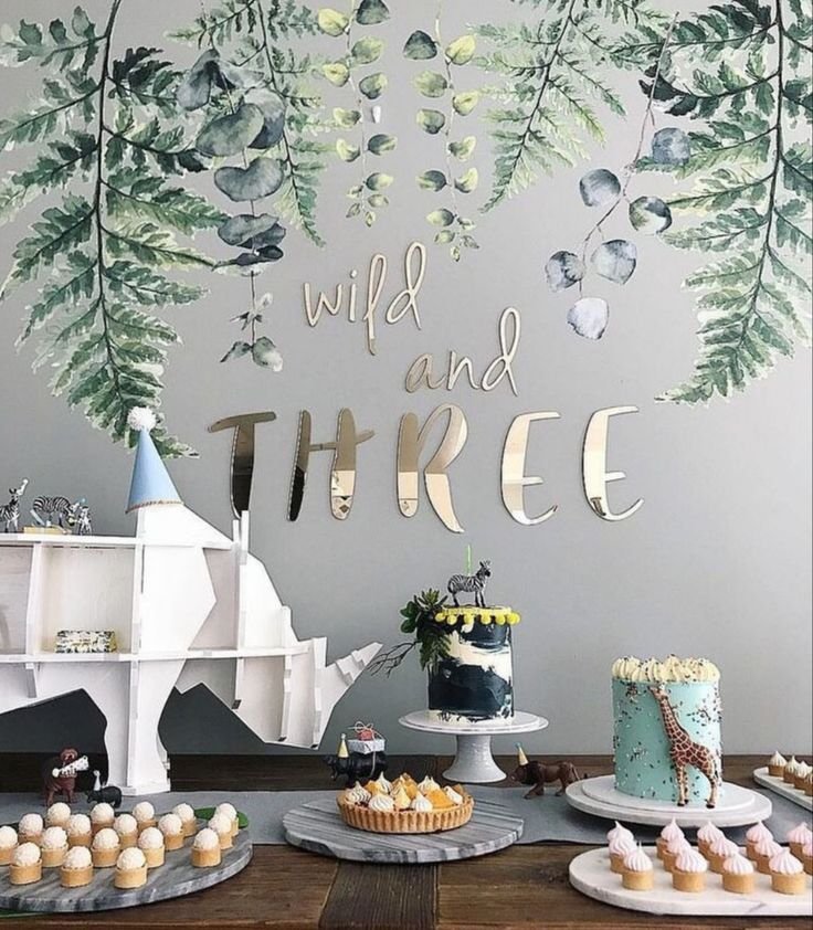 Step into an enchanting safari for a boy’s 3rd birthday party with this captivating dessert table setup. A “wild and THREE” mirrored sign shimmers against a backdrop of hanging green foliage, setting a chic, adventurous tone. The natural elements truly enhance the jungle vibe.