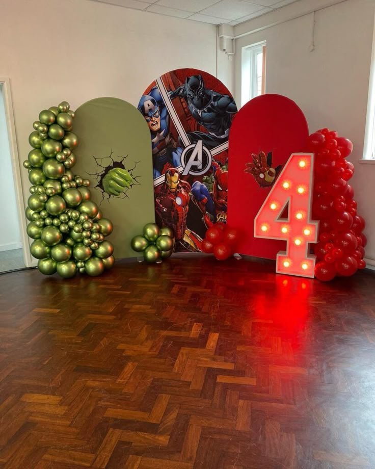 Transform any space into a bustling city with this vibrant superhero backdrop, a powerful choice for 4th birthday themes for boys. An illuminated number “4” commands attention, signifying the special occasion. Cardboard cutouts of iconic heroes like Captain America, Hulk, and Spider-Man are strategically placed around the scene.