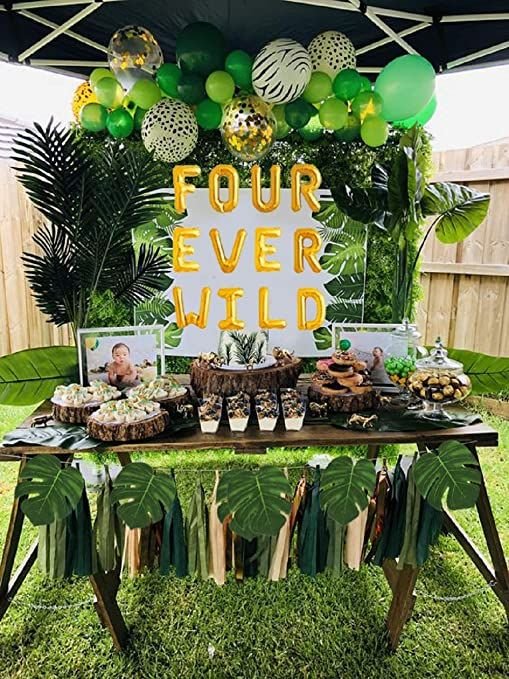 Embark on a grand safari adventure with this lively outdoor setup, an exciting choice among 4th birthday themes for boys. Golden “FOUR EVER WILD” balloons shine against a lush green backdrop. A vibrant balloon garland above features shades of green, gold, and playful animal print balloons.