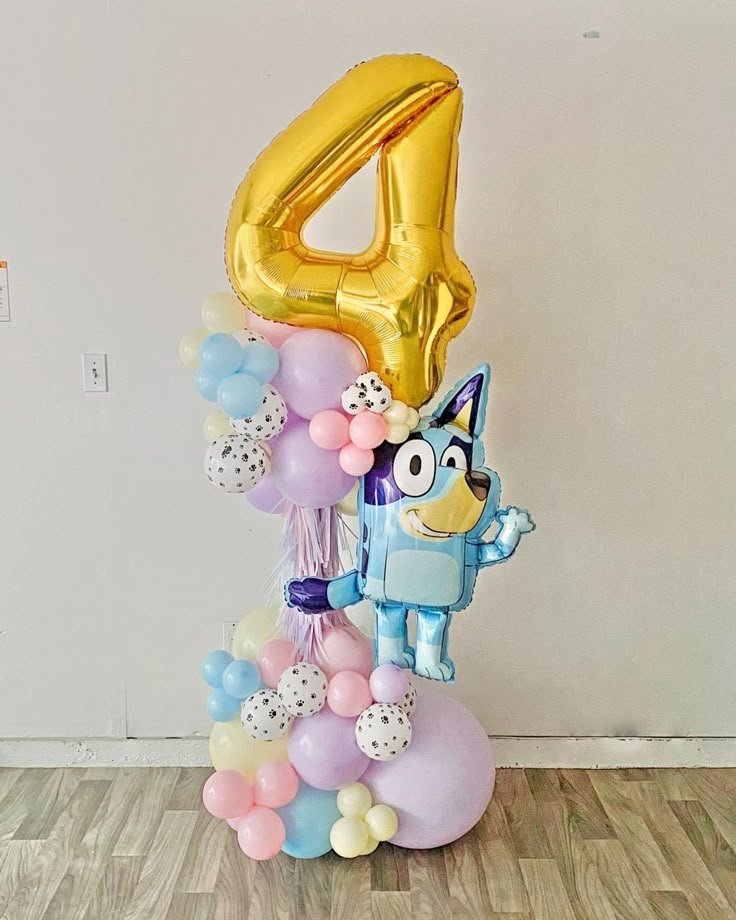 This delightful Bluey balloon arrangement offers a charming and popular option among 4th birthday themes for boys. A large, gleaming gold number “4” balloon sits atop the display. Below, a vibrant Bluey character balloon is featured prominently, ready for the celebration.