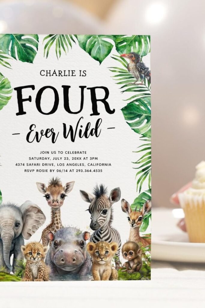 Announce a thrilling safari celebration with this adorable invitation, a fantastic beginning to 4th birthday themes for boys. Lush green leaves frame the design, setting a vibrant, natural scene. The bold text “CHARLIE IS FOUR – Ever Wild -” captures the adventurous spirit of the occasion.