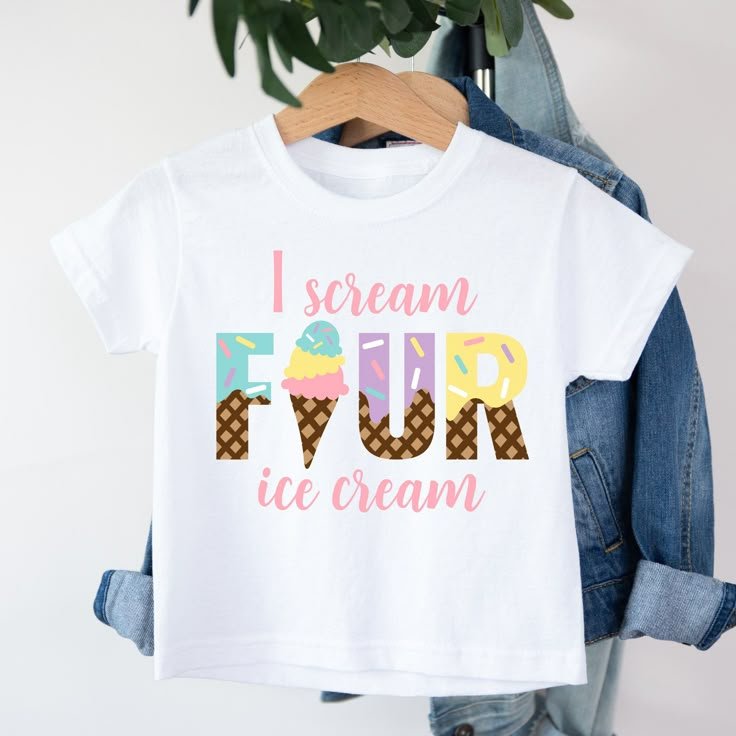 This charming “I Scream FOUR Ice Cream” t-shirt makes a deliciously cute choice for 4th birthday themes for boys. The word “FOUR” is creatively designed with an ice cream cone replacing the “O” and colorful sprinkles adorning the letters. Soft pastel colors of pink, blue, and yellow give it a playful and sweet appeal.