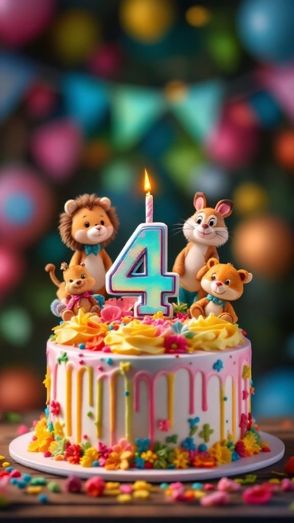 This charming cake has cute animal characters on it, making it a cute choice for 4th birthday party themes for boys. A smiling lion, happy rabbit, and sweet bear cubs are positioned around a colorful, glowing “4” candle. Colorful drizzles and happy flower garnishes adorn the cake itself.
