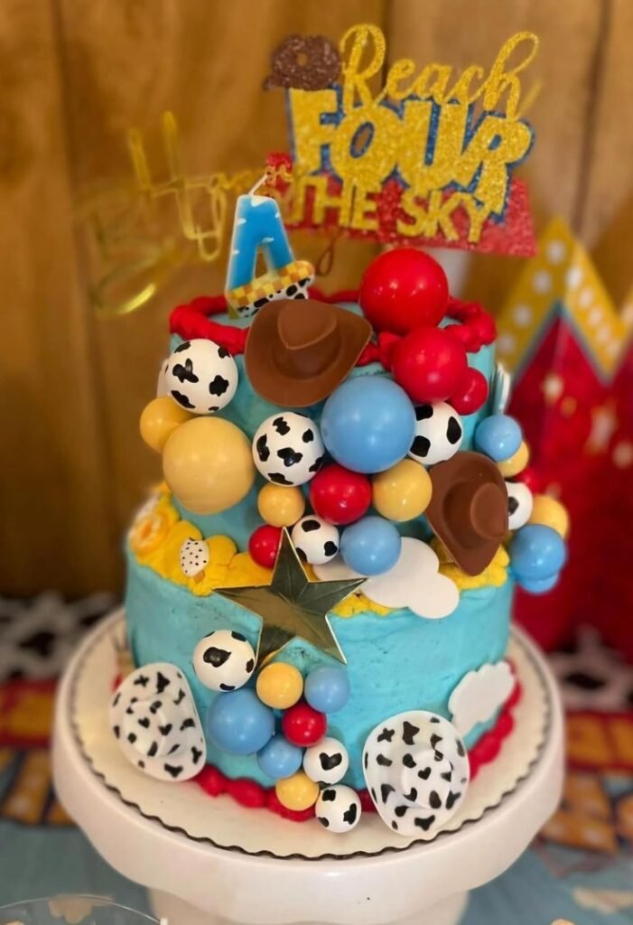 This vibrant cake beautifully captures a beloved toy adventure, making it a playful choice for 4th birthday themes for boys. It features a cheerful “Reach FOUR the Sky” topper. Cowboy hats, cow print balls, and colorful spheres decorate the bright blue tiers, reminiscent of a classic animated movie.