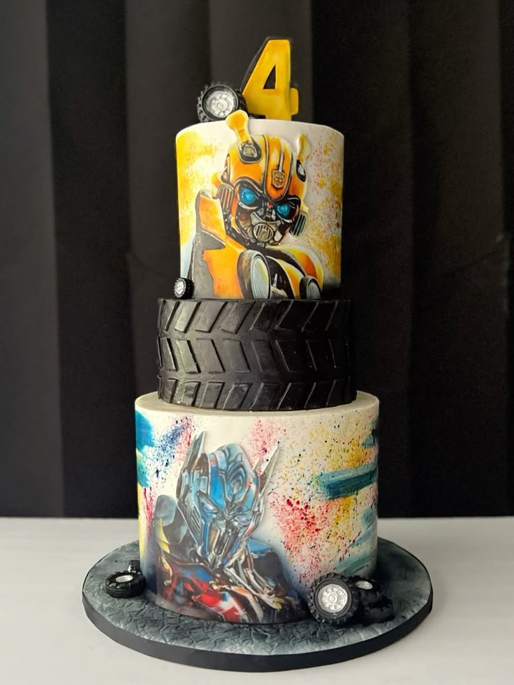 Transform a birthday into an epic adventure with this incredible Transformers cake, a powerful choice for 4th birthday themes for boys. The cake features vibrant edible artwork of beloved Autobots, including Bumblebee and Optimus Prime, against a colorful, splattered background. Each tier showcases dynamic character portraits, bringing the robots to life.