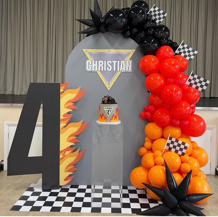 Rev up the party with this exciting Monster Jam theme, a high-octane choice for 4th birthday themes for boys. A vibrant balloon garland in red, orange, and black, accented with checkered flags, sets a dynamic scene. A personalized “Christian” sign sits above a matching monster truck cake, ready for action.