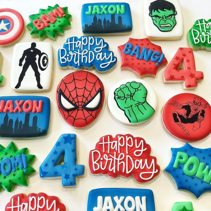 Cookies with the birthday boy’s name, “JAXON,” and the number “4” personalize the treats. Designs include a strong Hulk fist, a detailed Spiderman, and a silhouette of Captain America. The vibrant colors and clean lines make these cookies visually appealing and fun.