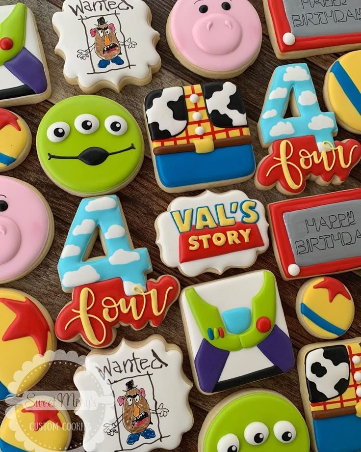 Cookies shaped like the number “4” with cloud patterns and others spelling “four” add to the festive fun. There are also “Wanted” posters of Mr. Potato Head and a piggy bank design. A special cookie reads “VAL’S STORY,” personalizing the sweet treats.