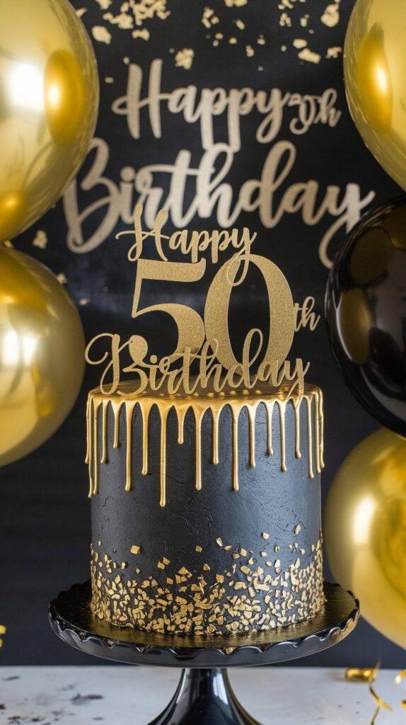 This stunning cake is a centerpiece for any celebration, fitting perfectly into the best 50th birthday party ideas for men. It features a smooth black exterior with dramatic gold drips.
