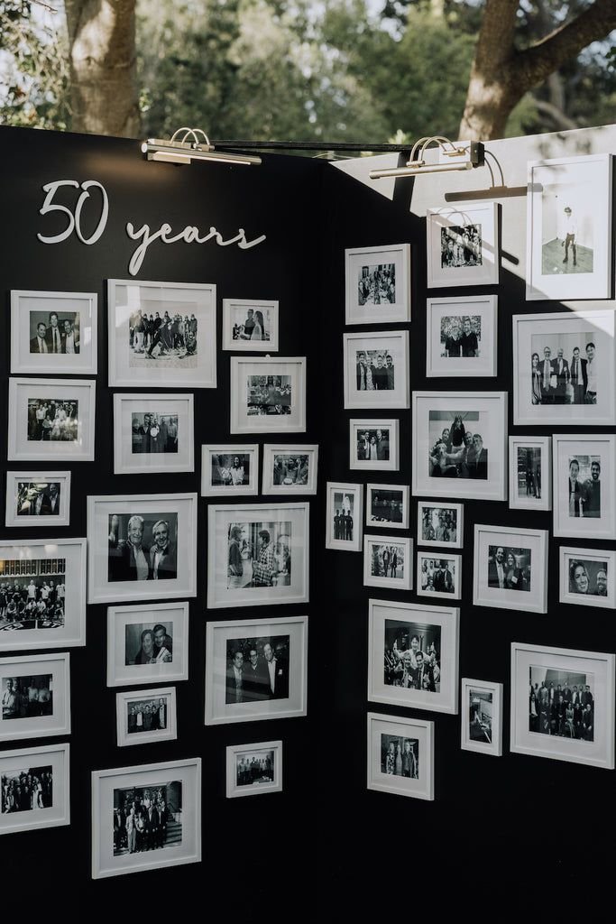 This photo wall offers a heartfelt and personal take on 50th birthday party ideas for men. It features a collection of black and white photos spanning the years.