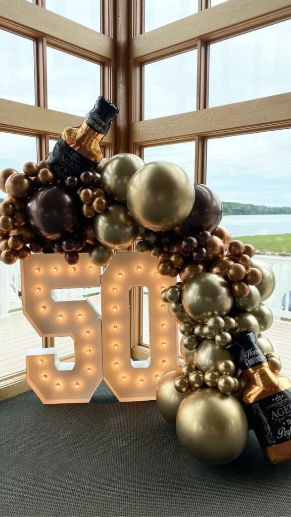 Two large, illuminated “50” numbers anchor the setup. The balloons include large bottles labeled “Happy Birthday Aged to Perfection.”
