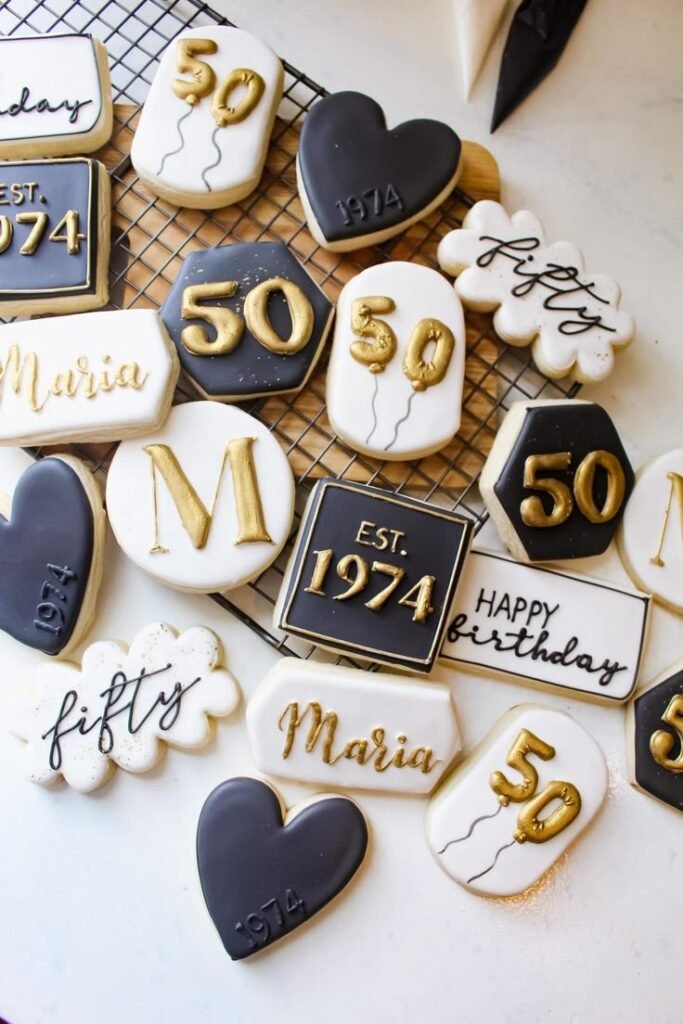These custom-made cookies are a sweet and personalized detail for 50th birthday party ideas for men. They feature a sophisticated black, white, and gold color scheme.
