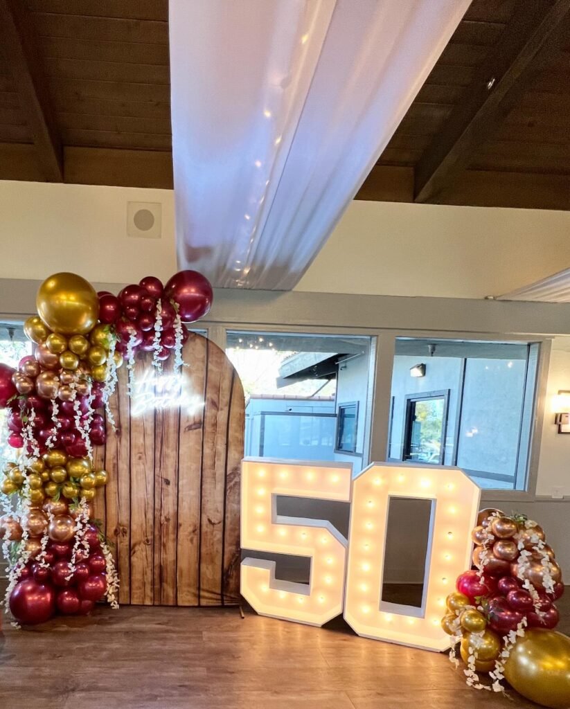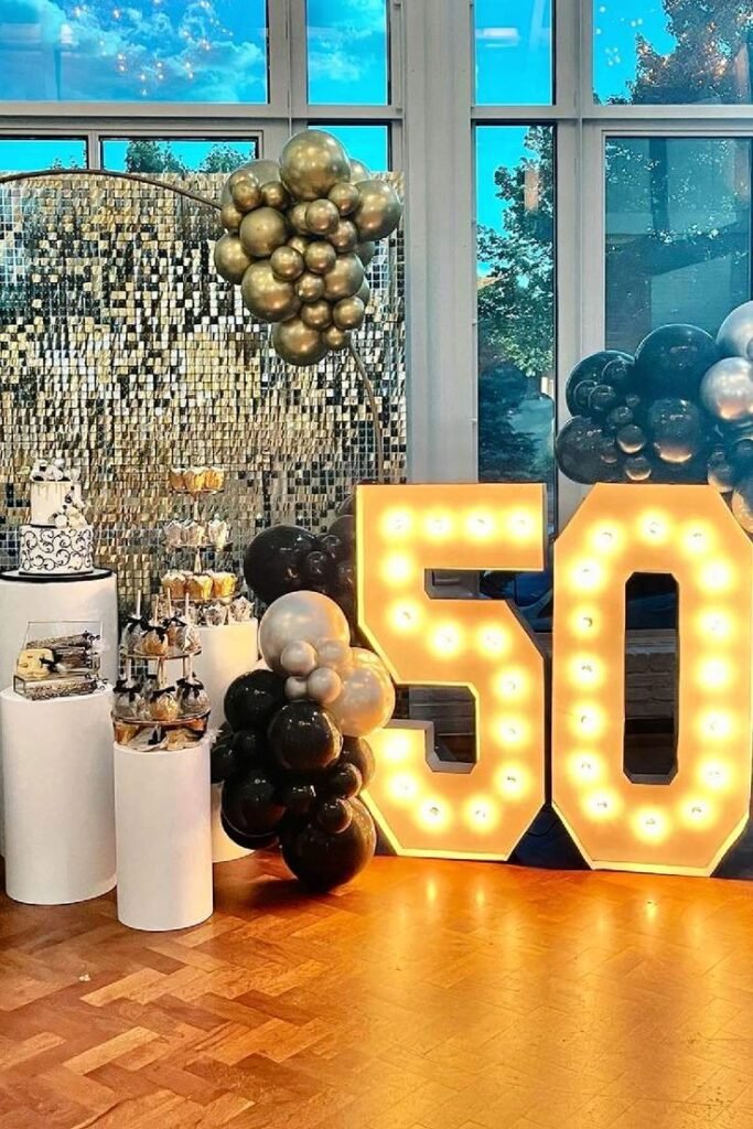 Giant, light-up “50” numbers create a bold focal point for the celebration. These glowing numbers add a festive and celebratory atmosphere.