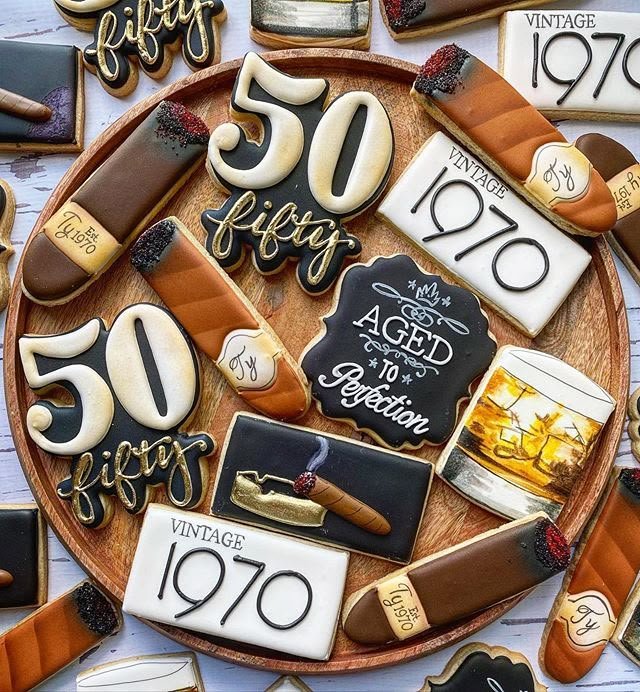 These themed cookies are a fun and delicious take on 50th birthday party ideas for men. The assortment includes elegant “50” cookies, cigar shapes, and “vintage 1970” signs.