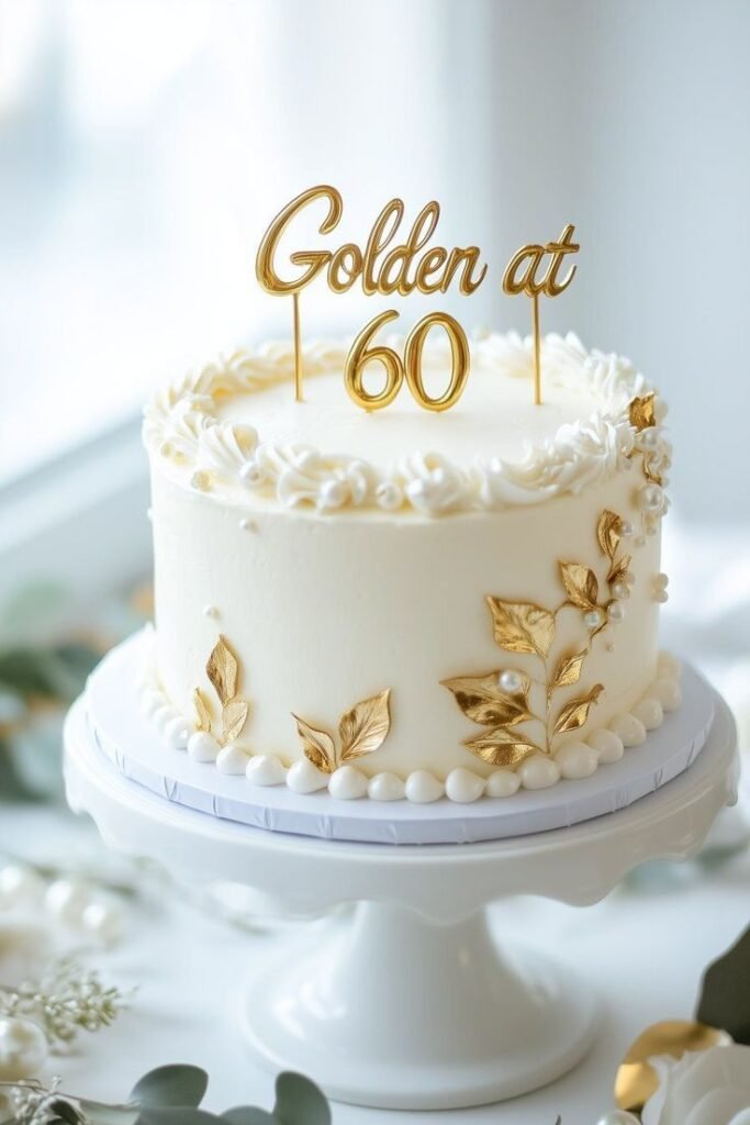 The cake is crowned with a gleaming gold topper that reads, “Golden at 60,” a fitting tribute. This simple but stunning design truly captures the celebratory spirit of the moment.
