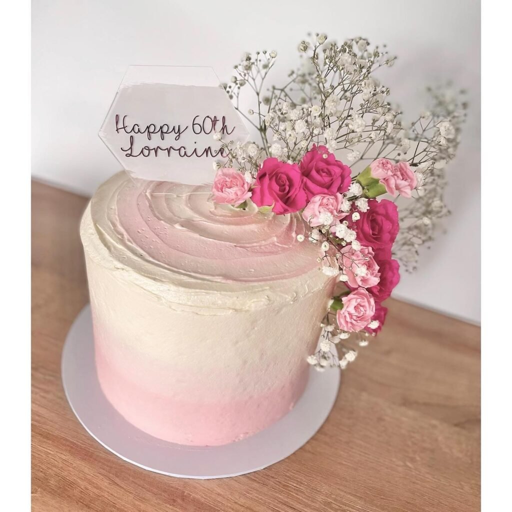 A clear acrylic topper with “Happy 60th Lorraine” adds a personal, modern touch. This beautifully crafted cake is a timeless and memorable way to honor a special person’s big day.