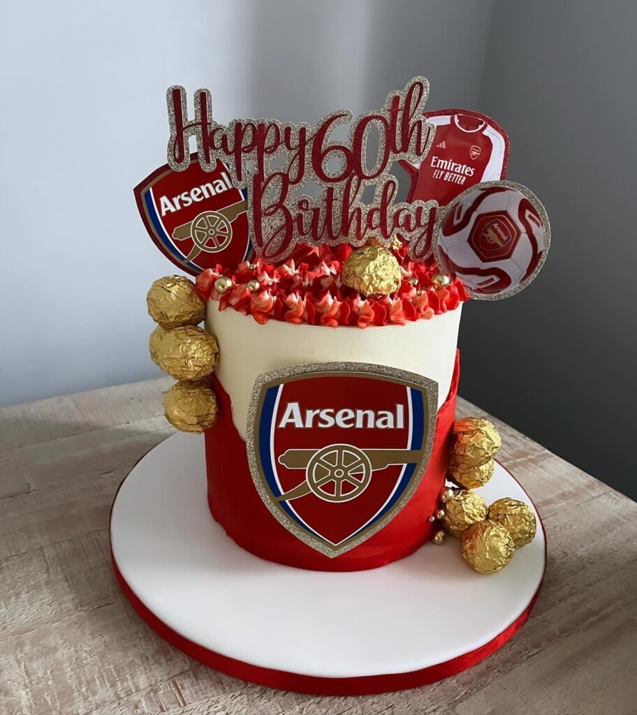 This exciting cake is a vibrant tribute to a die-hard Arsenal fan. The classic red and white team colors are used with flair, creating a bold, two-toned design. This cake is a celebration of a lifelong passion for the team.