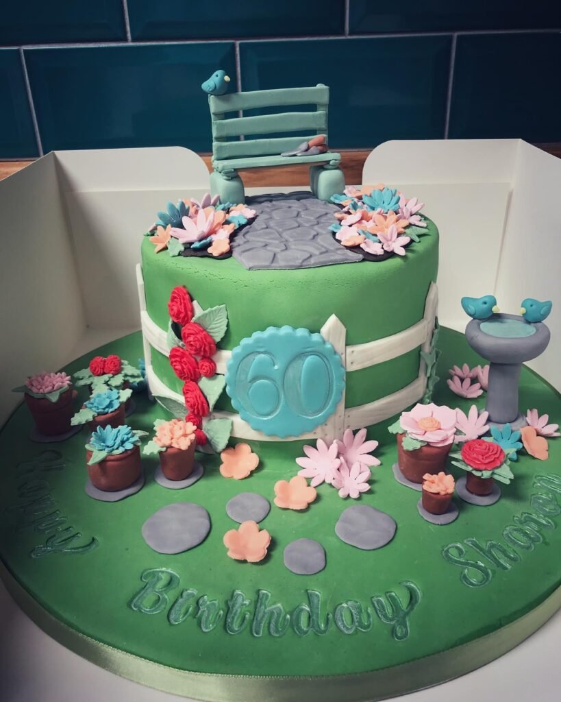 A plaque with a large “60” is prominently displayed on the side, marking the occasion. This imaginative and delightful cake is a fantastic way to honor someone who enjoys the simple pleasures of a beautiful garden.