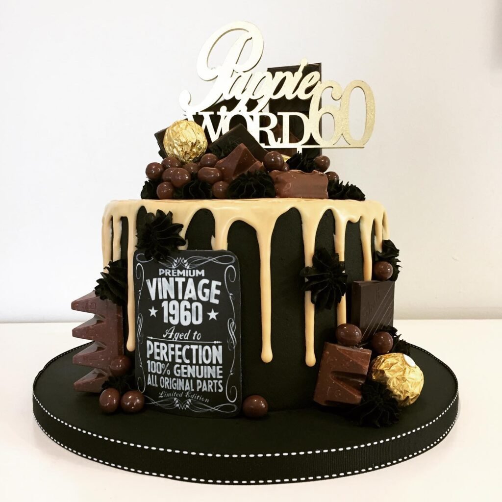 A clever vintage-style plaque humorously declares “Premium Vintage 1960,” adding a fun, personalized touch. This unique and visually appealing cake is an impressive way to celebrate a milestone.