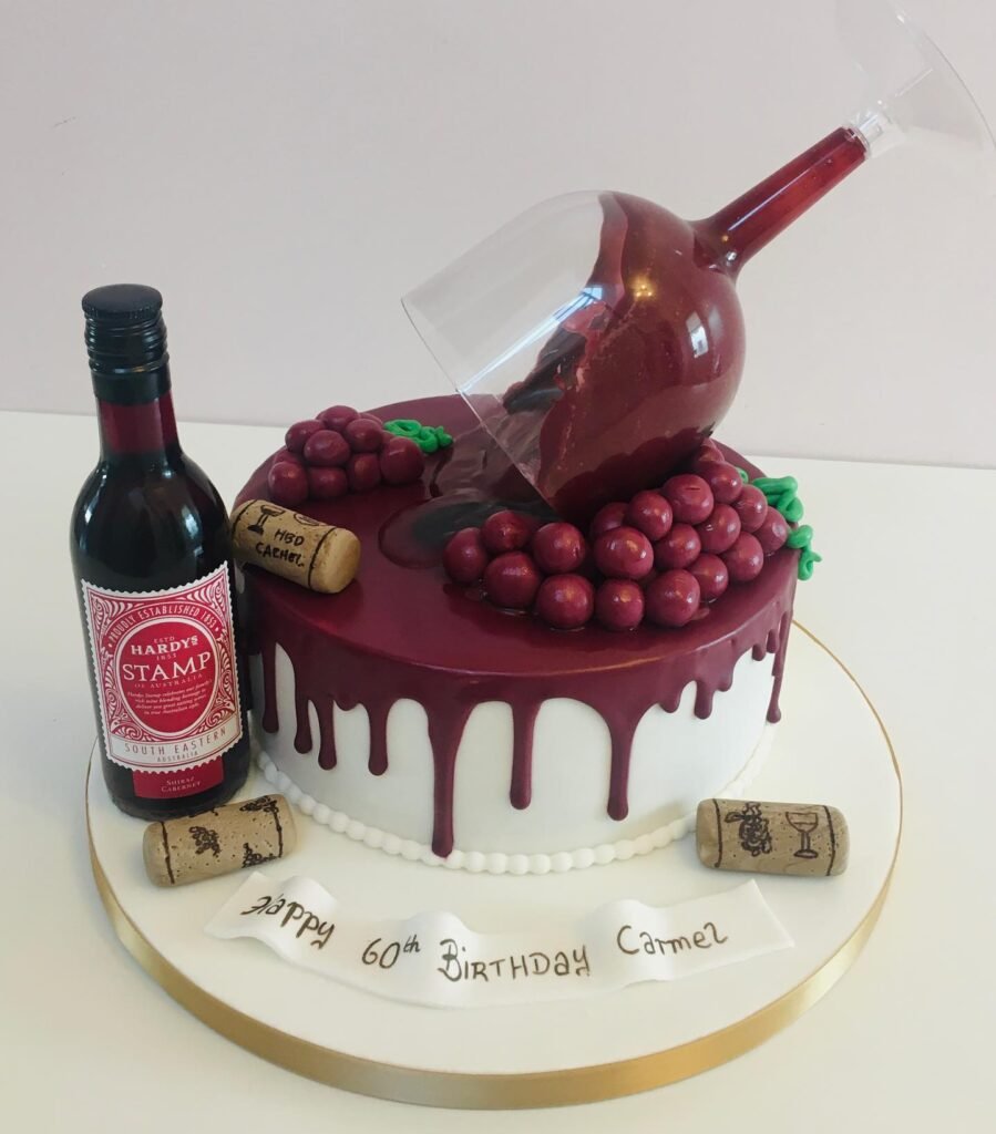 A banner on the cake board reads “Happy 60th Birthday Carmen,” adding a personalized touch. This beautiful and thematic cake is a fantastic way to celebrate a milestone with a toast to good taste.