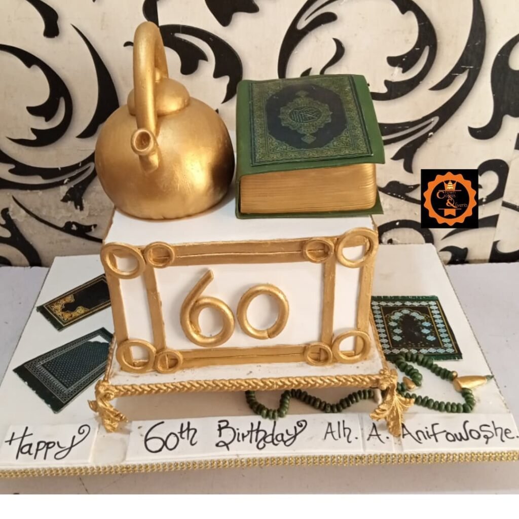 A personalized message on the board, “Happy 60th Birthday Alh. A. Anifowoshe,” adds a special touch. This beautiful and thoughtful cake is a wonderful way to honor a person of faith on their milestone birthday.