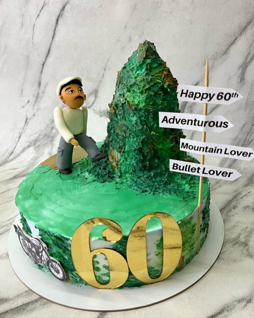 The cake’s base is a lush green landscape with a subtle motorbike detail. Large golden numbers “60” boldly mark this significant milestone, celebrating a life lived to its fullest.