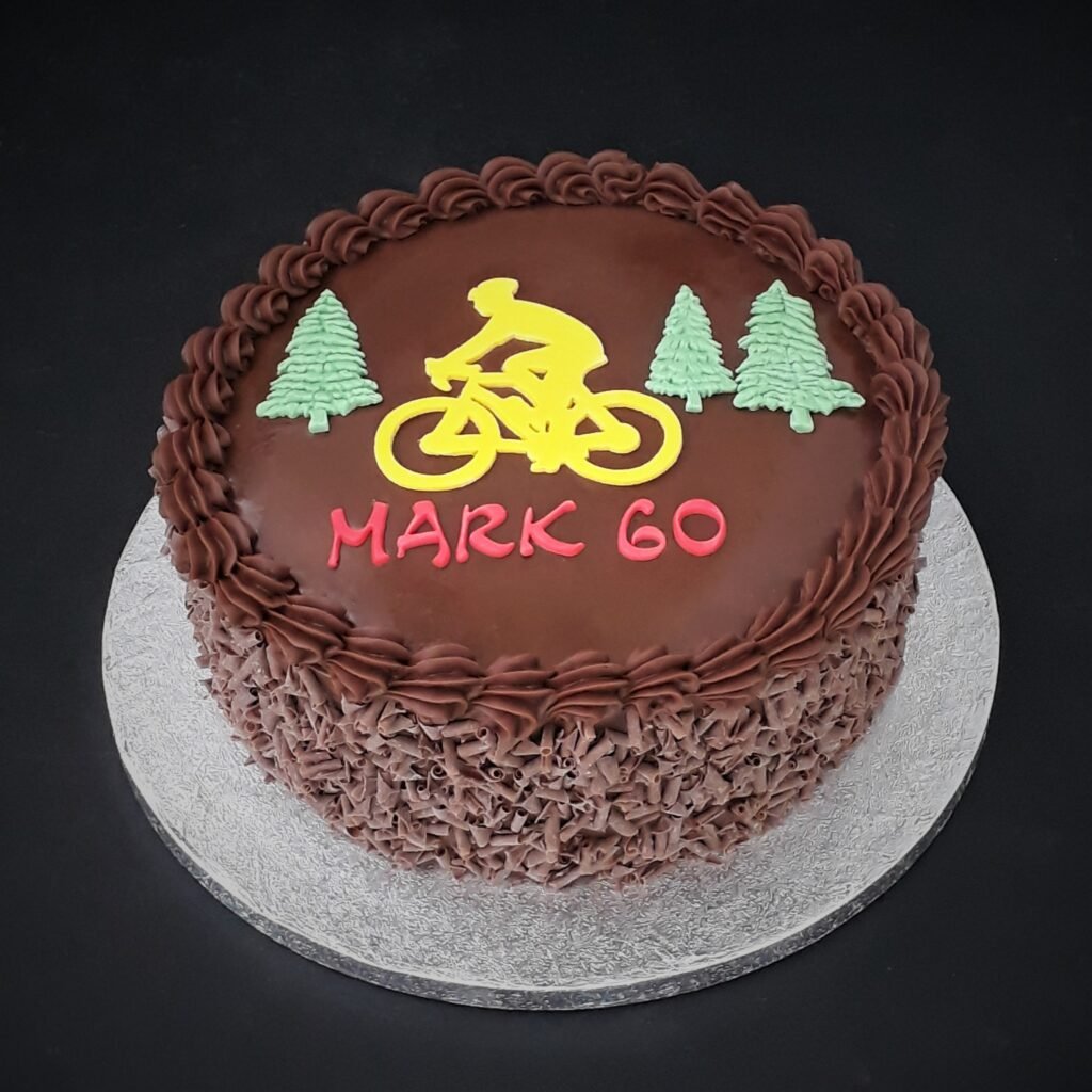 This delicious chocolate cake is a simple and thoughtful tribute to a cycling enthusiast. A bold yellow silhouette of a cyclist riding through a forest of green trees is a fantastic and personal way to mark the occasion.