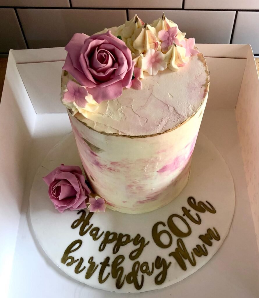 On the cake board, a flowing golden script reads “Happy 60th Birthday Mum,” adding a heartfelt and personalized touch. This beautiful cake is a perfect choice to honor a mother on her milestone birthday.