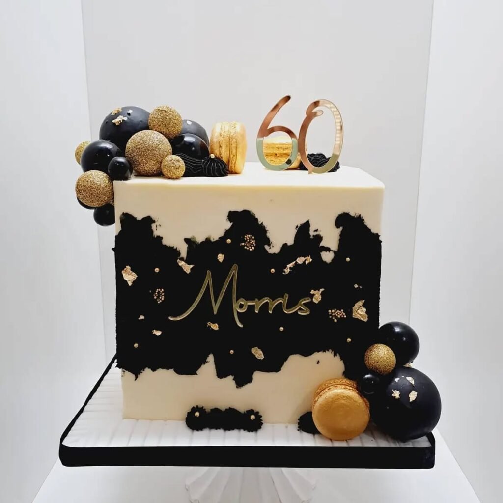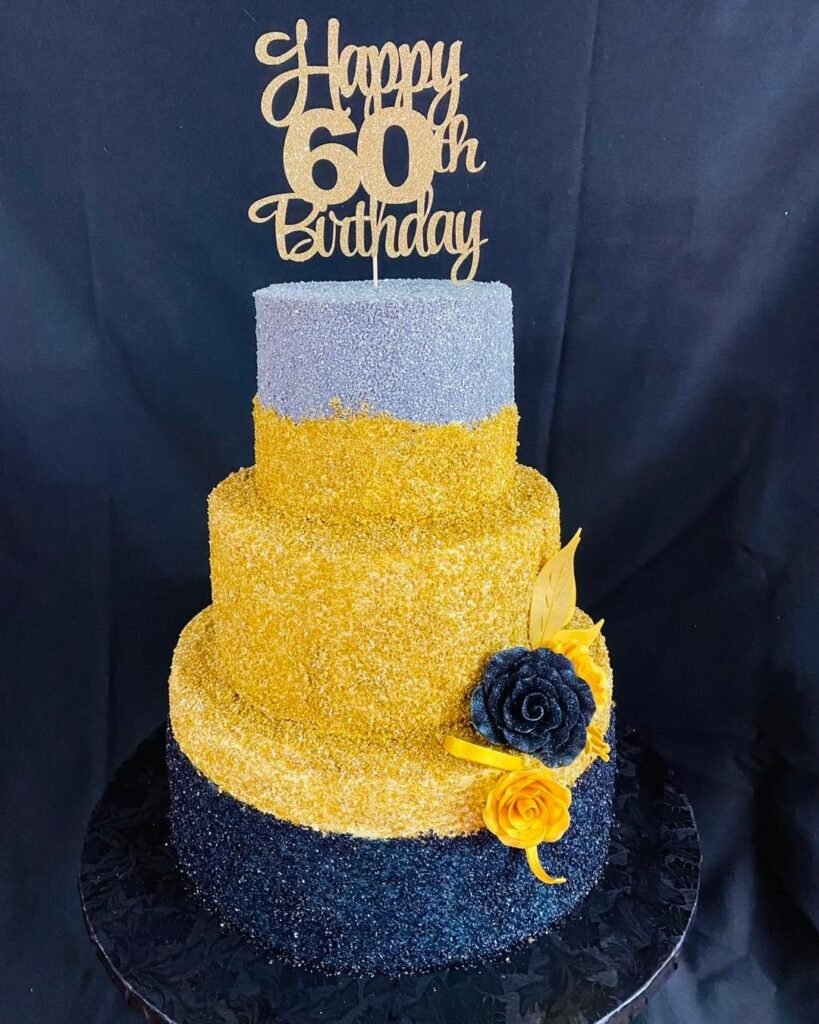 Large, sparkling black numbers “60” sit atop the cake, along with tall golden candles, creating a grand centerpiece. This cake is a truly luxurious and memorable way to celebrate this milestone birthday.
