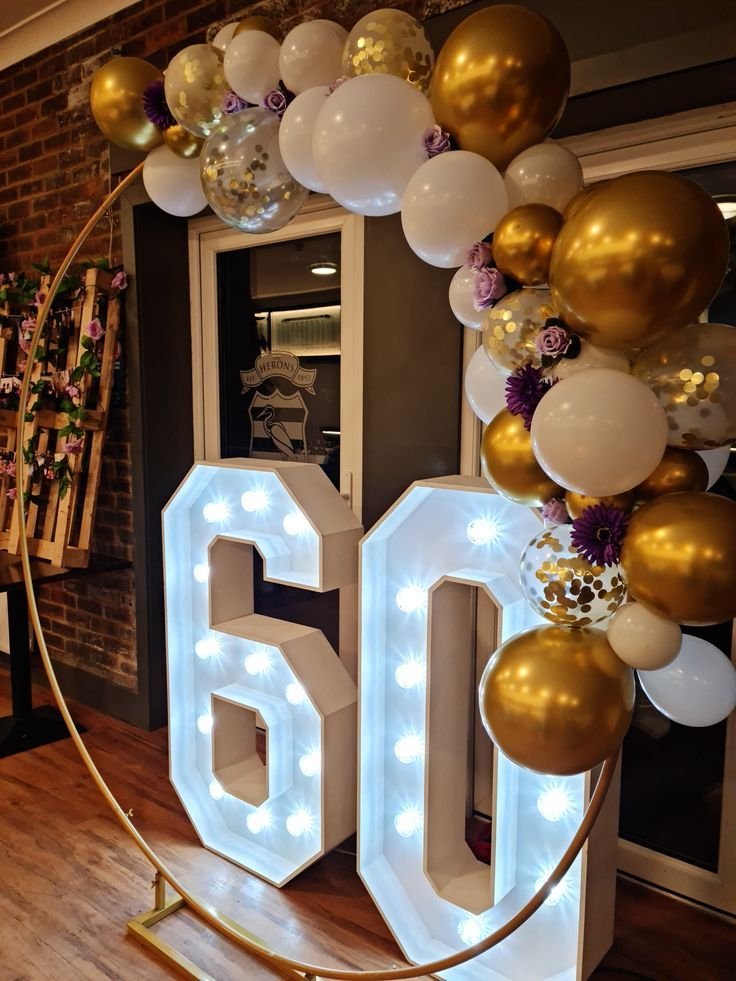 Create a captivating ambiance for a 60th birthday with this beautiful decor setup. Illuminated “60” marquee numbers cast a warm glow, setting a welcoming and festive scene. This display promises to make the honoree feel truly special.